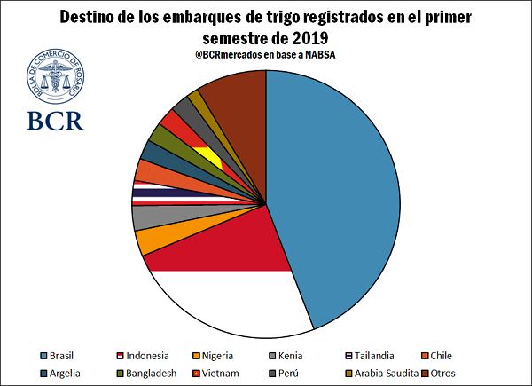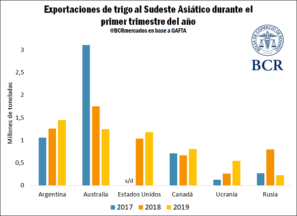En lo que va de 2019, en base a los ya mencionados datos de NABSA, Indonesia aparece como segundo principal destino del trigo argentino detrás de Brasil. Cerca de 1,6 Mt es el volumen del cereal adquirido por los demandantes indonesios, un 24,5% de los embarques totales. Tailandia se posiciona en quinto lugar con 195 mil toneladas, alrededor de un 3%. Analizados en conjunto, los países del Sudeste Asiático adquirieron cerca de 2 Mt, un 30,2% del total.