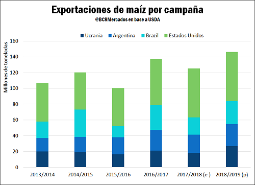 Este panorama no hace más que reforzar las expectativas de un nuevo record de exportaciones de maíz por parte de Brasil, manteniendo a raya los precios del cereal. Según la CONAB las exportaciones 18/19 alcanzarían 31 Mt, mientras que para el USDA este número sería de 29 Mt, ambos valores impulsados por un buena cosecha. Con una campaña optimista no sólo para Estados Unidos y Ucrania, sino también para Argentina y Brasil, las exportaciones totales de estos 4 principales países alcanzaría 146 Mt, un 6 % por encima de la campaña 16/17.