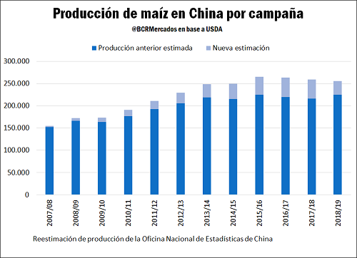 A estos fundamentals bajistas se le suman los mayores stocks en China, que aunque ya existían, ahora se conocen por parte del mercado luego de que la Oficina Estatal de Estadísticas de China (NBS, por sus siglas en inglés) reestimara los stocks que hay en este país, el cual a pesar de no participar del comercio mundial, es el segundo principal productor después de Estados Unidos. La revisión de la NBS agregó 266 millones de toneladas acumuladas a la producción para el período 2007/08 -2017/18. Esto hizo aumentar la estimación de stocks finales en 140 Mt. A pesar de las grandes existencias, según el USDA cualquier impulso potencial a las exportaciones debería ser mínimo, ya que el maíz de China es actualmente más caro en comparación con los mercados mundiales.
