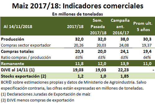 Observando ya la comercialización, más precisamente, las compras y las ventas del sector exportador, prácticamente se ha negociado toda la cosecha 17/18 de maíz. Esto se desprende de que el consumo interno del mismo sobrepasa las 11 Mt de toneladas por campaña, por lo que a mediados de noviembre no se espera mucho más grano por negociar.