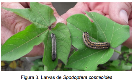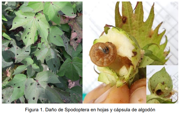 En el norte de Santa Fe, en la campaña 2019/2020 en cultivares de algodón, se han observado daños en hojas y frutos causados por diferentes larvas del género Spodoptera. Entre las especies se encuentran, en orden de importancia decreciente, S. frugiperda, S. cosmioides, S. eridania y S. albula, éstas dos últimas en menor proporción.