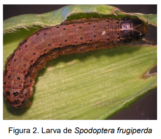 Todas las Spodopteras son reconocidas por presentar en el área frontal de la cabeza una Y invertida de color anaranjado/dorado. Luego entre las especies varia la coloración y disposición de líneas Spodoptera frugiperda: A lo largo del cuerpo, en la parte dorsal se observan tres líneas blancas y a los laterales se encuentran líneas laterales oscuras y gruesas. En el último segmento abdominal se observan cuatro puntos negros formando un cuadrado (Fig. 2).