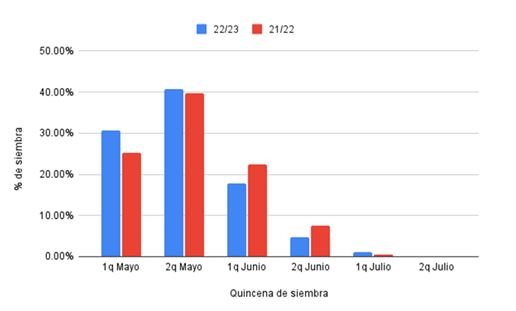 En el análisis de los datos que hizo SIMA, también denota que la estrategia productiva fue similar al comparar la campaña 2021/22 con la actual, donde las siembras “se concentran fuertemente” durante la segunda quincena de mayo.