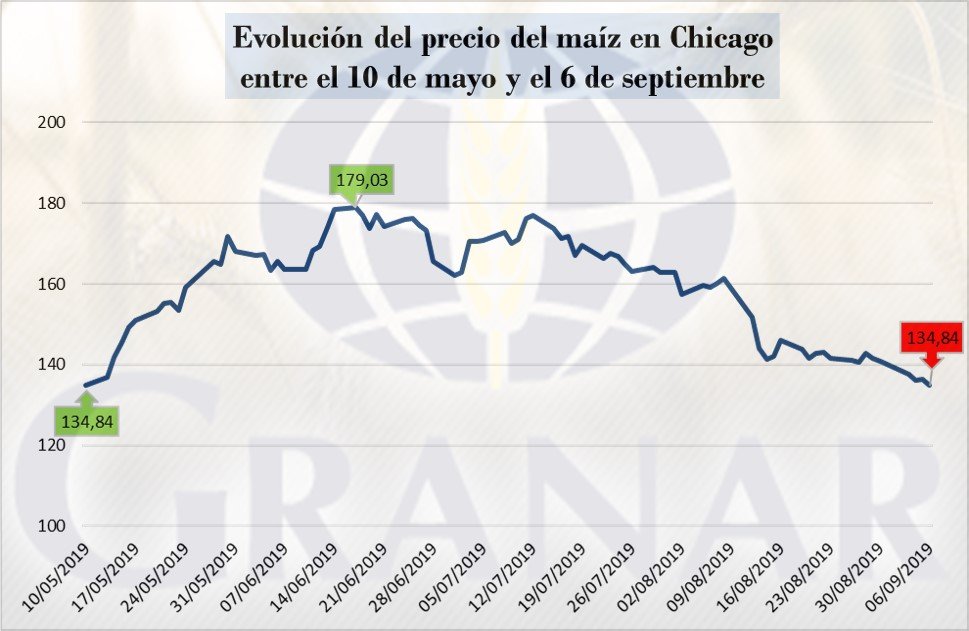 La semana fue muy negativa para los precios del maíz en la Bolsa de Chicago, donde los contratos septiembre y diciembre perdieron un 4,33 y un 3,85%, al pasar de 140,94 a 134,84 y de 145,56 a 139,95 dólares por tonelada. La mejora en la condición de los cultivos estadounidenses; la debilidad de la demanda externa, por la fuerte competencia que presentan Brasil, Ucrania y la Argentina, y la comprobación de que el “paquete gigante” de medidas prometido por Donald Trump para fomentar la demanda de etanol se encamina a ser una modesta suba en el mandato 2020 para mezclas de combustible fósil con biocombustibles, fueron los principales fundamentos bajistas para el mercado de maíz.