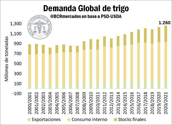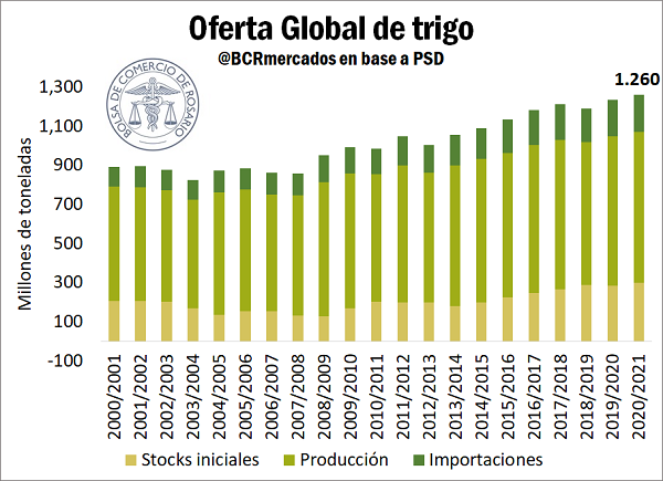Para la campaña 2020/21 se espera una producción de trigo récord a nivel global, con un total de 772 Mt, superando en 7,4 Mt el récord establecido en la campaña anterior. Esto, sumado a que también se espera un nivel de stocks iniciales en valores máximos jamás registrados (300 Mt), llevaría a la que la oferta total del cereal se sitúe un récord histórico. Esto toma gran relevancia cuando se considera al trigo como alimento para la población mundial con interés estratégico, especialmente en países con limitaciones productivas y alta población.