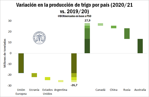 Sin embargo, en términos netos se espera un aumento en la producción. A las bajas destacadas en la Unión Europea y otras zonas productoras se les contrapone la producción de Australia. El país oceánico es, por amplio margen, quien registra el mayor incremento de su producción de trigo, tanto en términos absolutos (13,3 Mt más que en 2019/20) como en términos relativos (+ 87,5%). Este salto productivo es consecuencia de una campaña anterior con una sequía muy severa. Su magnitud fue tal que llevó la producción de trigo a niveles mínimos en 12 años.