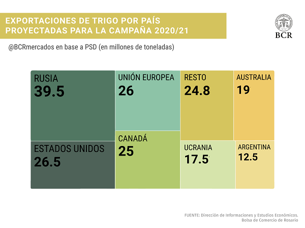 Del otro lado, entre los países que se proyecta experimentarán un aumento en las exportaciones se destaca Australia, duplicando la marca alcanzada la campaña anterior, seguido por Rusia (un 15% más que en 2019/20) y Canadá.