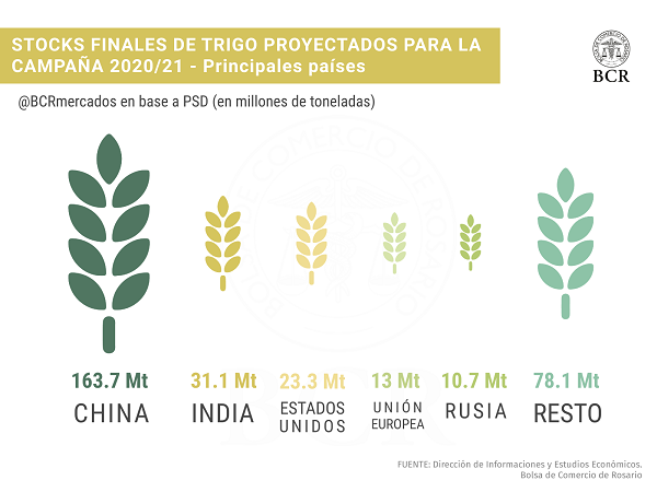 Por otro lado, no debe dejarse de lado la base geopolítica de la soberanía alimentaria. Como país más poblado del mundo (se acerca a 1450 millones de personas en 2020), la no dependencia de mercados externos en asuntos alimentarios es clave para el gobierno chino. Si bien China se autoabastece de trigo, ha duplicado sus importaciones en la última campaña. Se estima que esto se ha realizado en pos de asegurar sus importantes stocks de trigo, cerca de la mitad de los stocks globales y más de un año completo de consumo interno del cultivo. Además, se espera que los stocks mundiales caigan en un millón de toneladas, pero se mantienen altos en torno a los 320,5 Mt.