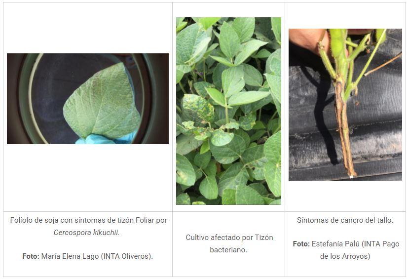 Evaluaciones realizadas en la Red de cultivares de soja Santa Fe sur, mostraron un comportamiento diferencial de cultivares, respecto a la misma. Al mismo tiempo, se registró la presencia de mancha bacteriana marrón por Curtobacterium flaccumfaciens, que se caracteriza por producir lesiones grandes en el margen de las hojas, con un marcado halo clorótico y áreas húmedas en el envés.