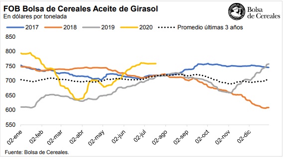 El resto, principalmente harina de proteína vegetal, se vende como insumo forrajero y tiene menor impacto en su cotización. El precio FOB del aceite de girasol en los puertos argentinos promedió 758 usd/tn en la primera mitad de julio. Siendo el valor más alto registrado en los últimos tres años, superando en un 6% a los valores del mismo periodo del año pasado. Por su elevada correlación, los precios del girasol muestran el mismo comportamiento que el aceite y se ubican por encima de los valores registrados en el mismo periodo de la campaña anterior. Si tomamos el precio Cámara de Bahía Blanca y el tipo de cambio vendedor del Banco Nación, en julio del 2020 el girasol promedió los 246 usd/tn, un 11% por encima de los 222 usd/tn que promediaba en julio del año pasado.
