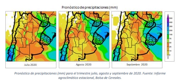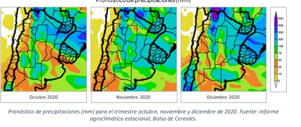 Hacia fines del invierno y comienzos de la primavera se espera una reactivación de las lluvias, aunque de manera irregular, sobre prácticamente todo el territorio, pero que acompañaría el crecimiento de los primeros lotes implantados y la siembra en las regiones del sur del área agrícola, hoy con sectores bajo excesos pero con tiempo suficiente como para recuperar piso.