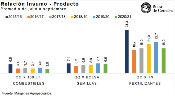 En cuanto a los costos, si bien en las últimas campañas se observa una tendencia a la disminución de los precios de los insumos claves para la producción del cultivo, en la campaña vigente esta reducción se profundizó. En detalle, los insumos relacionados con el precio del petróleo registraron considerables bajas como el caso de combustibles (-18 %), urea (-13 %) y fosfato diamónico (-13 %). En este sentido, se observa una mejora en la relación insumo-producto respecto a la campaña previa e incluso al promedio de las últimas cinco campañas. Esta relación muestra la cantidad de producto necesario para comprar una unidad de insumo, su baja refleja que se necesitará una menor cantidad de producto para comprar la misma cantidad de insumos. Las mejoras más importantes se registran en combustibles y fertilizantes.