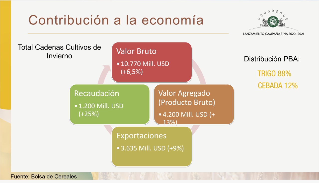 En términos de producción, Esteban Copati, jefe del Departamento de Estimaciones Agrícolas de la Bolsa de Cereales indicó que el trigo podría alcanzar un volumen récord de 21 millones de toneladas para la campaña 2020/21, mientras que la cebada mantiene un potencial de producción de 3,75 millones de toneladas. De concretarse dichas proyecciones, el aporte conjunto entre ambos cereales de invierno ascendería a un nuevo récord de 24,75 millones de toneladas.
