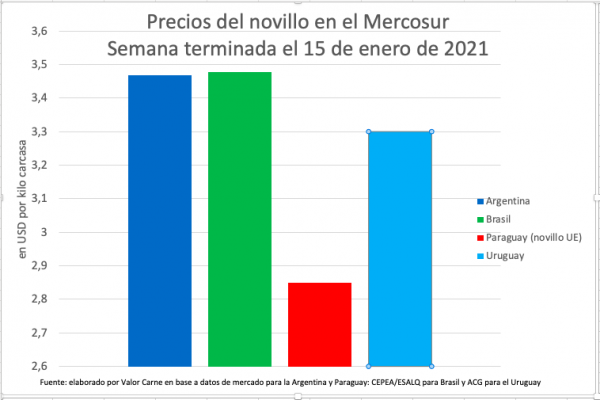 Uruguay: el novillo de exportación marcó USD3,30, dos centavos menos que hace una semana. Con recuperación de faena y oferta influida por el clima, el mercado oscila en el equilibrio según el juicio de los consignatarios. La faena de la semana pasada fue de 42 mil cabezas, 48% más que en la de fin de año y 7% menos que el promedio de las últimas diez. Las exportaciones de diciembre terminaron con 40 mil tec, con una caída interanual del 6%. En el año se completaron 415 mil tec, 12% menos que en 2019.