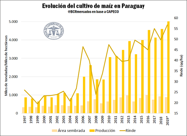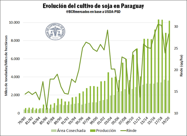 El informe de la institución expresa que en la zafra de 1999 la productividad por hectárea fue de 2.292 kg; sin embargo, esos niveles de rendimiento se elevaron 100% en dos décadas, pasando a registrarse alrededor de 5.500 kg por hectárea en la última campaña. Esta productividad generó que en 20 años Paraguay pasara de producir 656 mil t sobre 332 mil hectáreas en 1999 a 5 Mt sobre 885 mil hectáreas que se estiman para 2019.