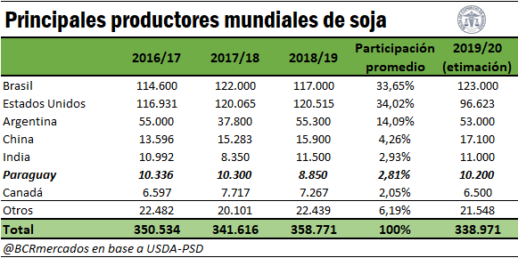 Luego de la sequía que afectó la última cosecha (2018/19), donde se obtuvo una producción de 8,85 Mt (caída 14,1% respecto al ciclo previo), el Departamento de Agricultura de Estados Unidos (USDA) proyecta para la campaña 2019/20 una cosecha de 10,2 Mt, quedando algo por debajo del récord de 10,34 Mt registrado en la 2016/17. Esta estimación en un contexto de caída de producción en la India llevaría a Paraguay a ubicar el puesto número 5 entre los principales productores.