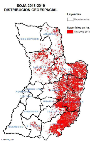 La distribución espacial del cultivo de soja muestra una concentración en el extremo este de la región Oriental con dos focos productivos fuera de la zona tradicional, uno en la porción norte, en los departamentos de San Pedro y Amambay, otro en el sur, en el departamento de Misiones. Los mayores rendimientos por hectárea se presentan en las áreas históricas del cultivo, varias zonas de los departamentos de Alto Paraná, Canindeyú, Itapúa y Caaguazú, a las que se sumó también la región del noroeste de Caazapá.