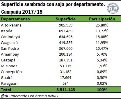 Según datos del Instituto de Biotecnología Agrícola (INBIO) para la campaña 2017/2018, el departamento de Alto Paraná concentra la mayor parte del área sembrada con 906 mil hectáreas, un 25,8% del total. Por detrás aparecen los departamentos de Itapúa, con 692 mil hectáreas (un 19,7%), y Canindeyú, con 635 mil hectáreas (18,1%). Más atrás se ubica Caaguazú con 420 mil hectáreas (12%), seguido por San Pedro, departamento de la parte norte de la región Oriental, con 368 mil hectáreas (10,5%).