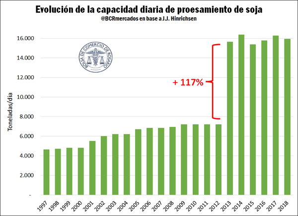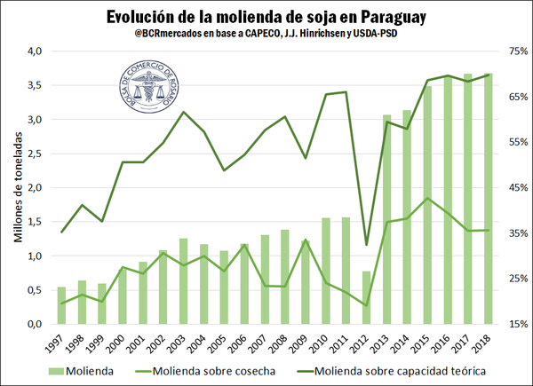 A la par del aumento en la capacidad de procesamiento crecieron los volúmenes de la molienda. Entre 1997 y 2018, según datos de CAPECO, el tonelaje de soja industrializado creció cerca de un 580%, pasando de 540 mil toneladas a casi 3,8 Mt. En ese mismo período, se observa que la molienda tuvo un crecimiento superior al 244% en el que se incrementó la capacidad teórica de procesamiento, lo que se explica por un mejor aprovechamiento de las instalaciones como puede notarse en el gráfico adjunto.