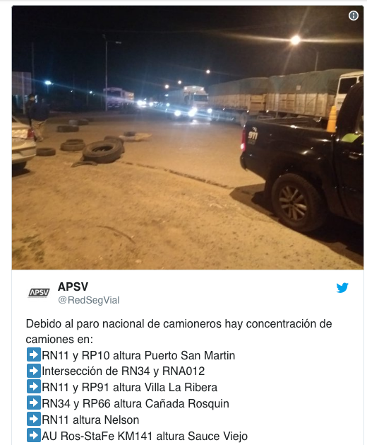 Al respecto la Agencia de Seguridad Vial de Santa Fe, informó que los camioneros manifiestan en los siguientes puntos: RN 11 y RP 10, altura de Puerto General San Martín; RN 34 y RN A012; RN 11 y RP 91, altura de La Ribera; RN 34 Y RP 66, altura de Cañada Rosquín; Autopista Rosario-Santa Fe, km 141, altura Sauce Viejo; RN 11, altura de Nelson.