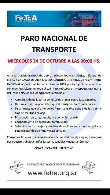 Economía y políticaParo nacional de transporte de granos 19 de octubre de 2018FacebookTwitterWhatsAppTelegramEmailImpresión El paro fue anunciado por la Federación de Transportadores Argentinos (Fe.Tra.A).A continuación, el comunicado completo.
