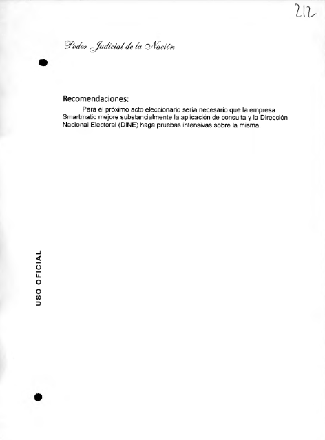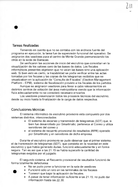 En otro tramo del informe, los veedores encambio adujeron que sí funcionó correctamente el sistema de transmisión de telegramas, “que consistía en la novedad en este escrutinio y que había generado dudas”.