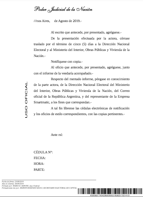 La designación de los veedores por parte de la jueza fue a raíz de una presentación del Frente de Todos para apartar a la empresa Smartmatic del proceso de escrutinio.