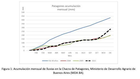 En el secano central de Patagones, la sequía de doce meses de duración (Figura 1) se interrumpió abruptamente el 20 de enero de 2022. Las lluvias, que fueron inusualmente copiosas, se iniciaron en forma muy gradual. Hacia el final, la precipitación fue más intensa, llevando a que la acumulación total de fuera extremadamente elevada (Figura 2). Debido a la imprevista inundación de cascos, la lluvia produjo ingratos sucesos de aislación de personas y pérdidas materiales. Durante la sequía previa, la falta d e forraje hizo que la hacienda vacuna y ovina perdiera su condición corporal. Las lluvias de enero 2022 recargaron con agua los suelos, generando muy buenas condiciones para el revenimiento del recurso forrajero. Esta situación benigna para la recuperación de la ganadería, enfrenta algunos desafíos de manejo que conviene tener en cuenta para evitar desórdenes metabólicos. Estas condiciones de humedad y temperatura, generaran un crecimiento acelerado de las pasturas naturales e implantadas y de otras forra jeras cultivadas como el sorgo. El sorgo es la pastura que requiere algunas consideraciones para el inicio del pastoreo, ya que puede presentar acumulación de un glucósido cianogenético tóxico. Si bien se considera que este compuesto desaparece cuando las plantas superan los 60 cm de altura, los pastoreos iniciales de los sorgos deben hacerse por períodos muy breves y manteniendo vigilancia sobre la hacienda.