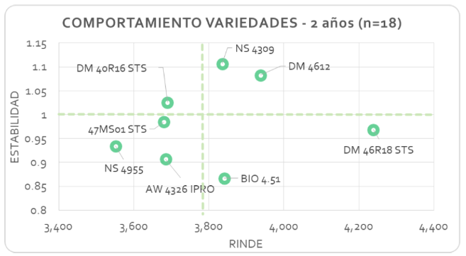 Al evaluar la relación rendimiento/estabilidad con los datos de los ensayos realizados en las últimas dos campañas en la región CREA Oeste, se observó que el genotipo más destacado con un rendimiento mayor al promedio (casi 38 qq/ha) fue DM 46R18 STS, mientras que BIO 4.51 también superó a la media con una mayor estabilidad en los diferentes ambientes evaluados.