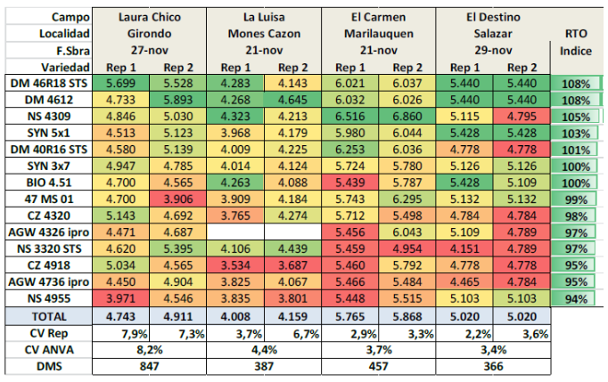 Los cultivares NS 4309 y DM 4612, por su parte, mostraron un rendimiento promedio superior a la media, aunque con un comportamiento más destacado en los ambientes con mayor potencial. Los sitios se ubicaron en ambientes de media loma con acceso a napa.