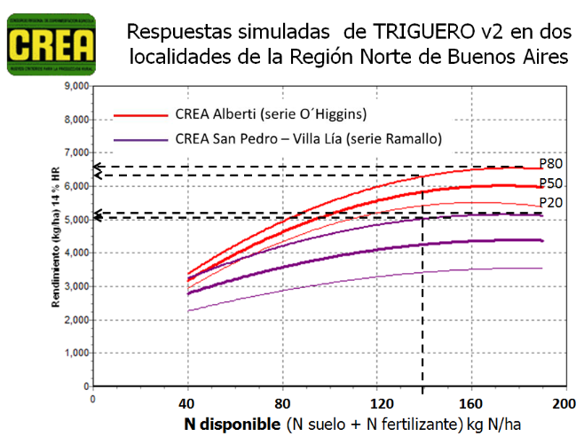 “Para la región Norte de Buenos Aires, en dos grupos CREA muy distintos –uno ubicado al este y otro al oeste de esa zona–, con el mismo manejo de fertilización nitrogenada podemos llegar a tener resultados muy diferentes. Triguero nos permite explorar la variabilidad probable en cada una de esos ambientes y el resultado alcanzable en función de los diferentes escenarios climáticos”, apuntó.