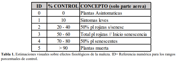 De acuerdo a lo mencionado anteriormente y a comentarios de productores y técnicos zonales sobre posibles escapes o dificultades para controlar Sorgo de Alepo con herbicidas inhibidores de la enzima ALS, se decidió llevar a cabo un ensayo a campo para determinar la sensibilidad actual de la especie a distintos herbicidas. El ensayo comenzó con las primeras emergencias de Sorgo de Alepo perenne, donde se realizaron 3 escenarios mecánicos: A- Sin labranza; B- Cuchillas verticales planas a 0,52 cm de distancia; C- Paratil de campo. Sobre estos se aplicaron diferentes tratamientos químicos, los cuales fueron: T= Testigo químico; G+C= Glifosato+Cletodim y I+I= Imazapir+Imazapic, (Dosis recomendada por el fabricante), cuando la maleza presentaba un activo crecimiento, una altura de 50-70 cm y el suelo en capacidad de campo. El control se evaluó mediante estimaciones visuales (Tabla 1) a los 20 y 35 días después de la aplicación (DDA) con el porcentaje de materia seca (MS) aérea. Cada tratamiento contó con 3 repeticiones y todos estuvieron aleatorizados.