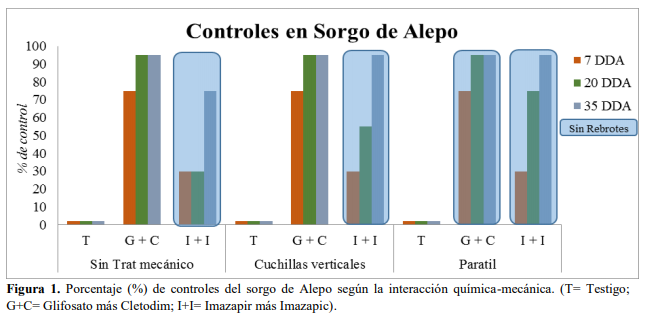 Como conclusión de este ensayo comparativo, se vio en la misma población de Sorgo de Alepo variación en la sensibilidad a los herbicidas. Para el caso de los inhibidores de la enzima ALS, el empleo temprano de una labranza vertical que altere la biomasa de los rizomas, mejora el control haciendo más eficiente la acción del herbicida. Lo mismo ocurrió con glifosato+cletodim sobre la labor del paratil, que a los 35 DDA la maleza presentaba un excelente control sin presencia de rebrotes. Muchas veces, el manejo químico se vuelve rutinario y no se consideran aspectos biológicos de las malezas, como tampoco se tiene en cuenta la implementación de programas de manejo que incluyan otras alternativas de control. Para consolidar un manejo acorde y eficiente de malezas, se deben incluir todas las alternativas de manejo, esto implica una actitud proactiva y un conocimiento de la situación particular de cada lote, y muchas veces salir del modelo productivo basado en una alta dependencia de un número reducido de herbicida.