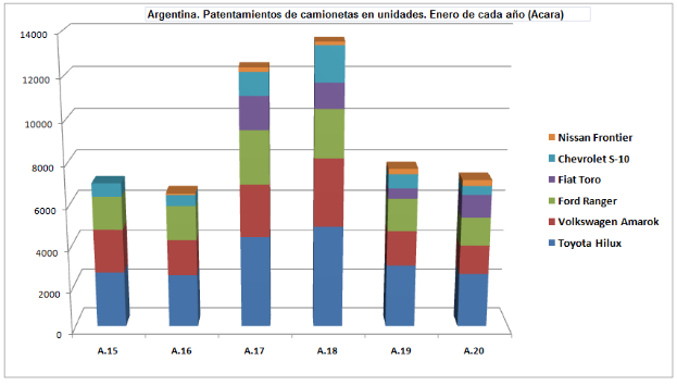 En el primer mes de 2020 se patentaron 7174 unidades de las seis camionetas de mayor uso en el ámbito agropecuario argentino, una cifra inferior a las 7673 registradas en enero de 2019, según datos de la Asociación de Concesionarios de Automotores (Acara).