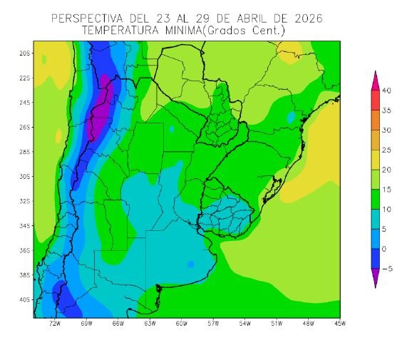 El centro-oeste del NOA, el centro de Cuyo, el sur de la Región Pampeana, el sur de la Mesopotamia y la mayor parte del Uruguay observarán temperaturas mínimas entre 10 y 15 °C, con focos con valores inferiores con leve riesgo de heladas localizadas.