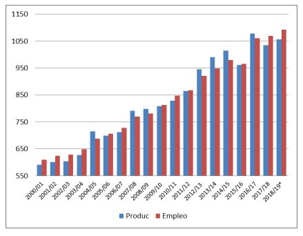 Se observa en el ciclo 2017/18 y en la proyección 2018/19 una caída de la relación que permite esperar una base positiva para el precio a nivel internacional en el supuesto que la situación climática, financiera y comercial mundial se mantenga estable. A nivel provincial la situación del maíz ha tenido un positivo desarrollo desde 2010 con importantes incrementos en superficie y producción, esto se muestra en el gráfico 3.