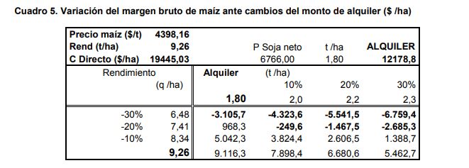 Los rindes de indiferencia, en el promedio, tanto en maíz como en soja bajan un 10 % respecto al ciclo pasado, esto implica un menor riesgo asociado a la producción en tierra alquilada. De esta forma en el caso de maíz se requiere, pagando un alquiler de soja de 18 q /ha un rinde de indiferencia que es 27 % menor al promedio de productividad zonal mientras que en soja de primera se necesita un valor más alto, por lo menos una productividad 20 % menor al promedio para pagar todos los costos incluyendo el alquiler. De este modo se muestra más segura la elección de maíz, desde el punto de vista económico pero no financiero, en el caso de alquilar. En el cuadro 5 se analiza la sensibilidad del margen del maíz para el arrendatario ante cambios del monto del alquiler y de rindes.
