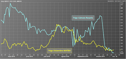 Con el ingreso de los primeros lotes de la nueva campaña, los precios del disponible han convergido a los del futuro diciembre para descarga en los puertos del Gran Rosario que cotizan en MATBA, representativos de la nueva campaña triguera. Al día jueves, la referencia de la Cámara Arbitral de Cereales rosarina quedó establecida en $ 6.200/t, con una variación semanal del (-3%). En MATBA, en tanto, ajustó el jueves a US$ 179,5/t, en tanto que el futuro de referencia que expira en diciembre cerró a US$ 180/t, en ambos casos para la descarga en las terminales portuarias del Gran Rosario.