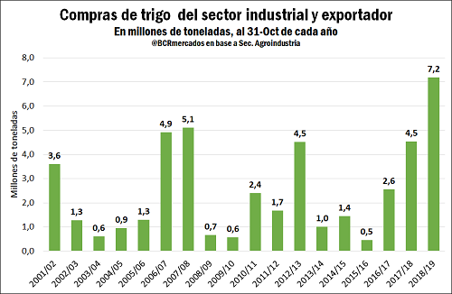 De este modo, y como señal de lo anterior, las ventas finales de grano de trigo (es decir, lo comprado por su usuario final, sea industrial o exportador) alcanza un récord histórico al cierre de octubre de 7,2 millones de toneladas, un 60% por encima a lo negociado a esta altura del año anterior y cerca de tres veces más de lo comercializado al 30 de octubre de los últimos tres años.
