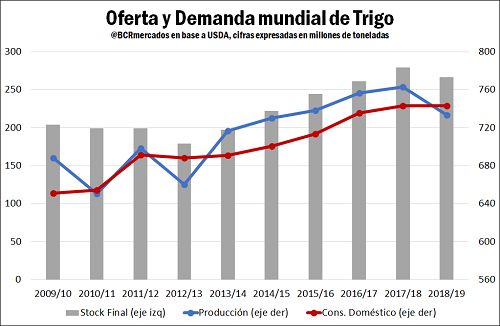 En suma, si bien el USDA incrementó su previsión de producción mundial de trigo 2018/19 en 2,6 Mt hasta los 733,5 Mt y los stocks iniciales en 5Mt a 279 Mt, en ambos casos debido fundamentalmente a las mayores disponibilidades chinas, el incremento de 6,5 Mt en los stocks finales, si bien lograron presionar a la baja el precio del trigo en el mercado de Chicago, aún no resulta suficiente para revertir la caída de inventarios que se espera para la nueva campaña. Efectivamente, por primera vez desde la campaña 2012/13 (cuando los precios de los commodities tocaron un récord histórico) el consumo mundial de trigo superaría a su producción, dando lugar a un ajuste en el nivel de stocks.