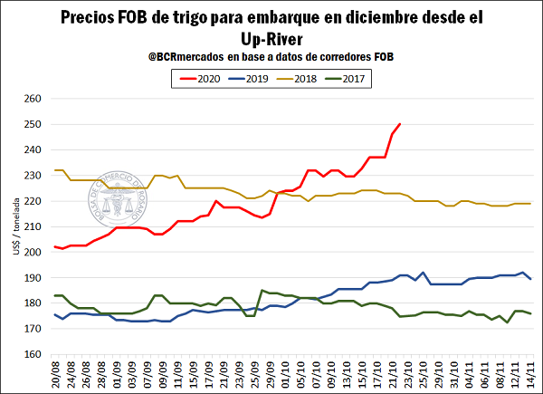 En la última semana tuvimos una considerable mejora en la oferta de compra por trigo en la plaza local, ofreciéndose de forma generalizada US$ 220/t por el cereal con entrega en los meses de noviembre y diciembre, unos US$ 10/t por encima de los valores en los que se negociaban en la semana previa, aunque los volúmenes anotados continúan siendo discretos.