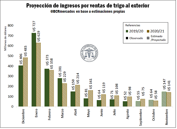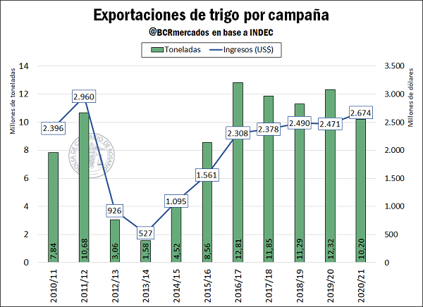 Según precios de mercado y proyectando una distribución de embarques a lo largo de la campaña en sintonía con las campañas previas, los ingresos por ventas de trigo al exterior entre diciembre 2020 y noviembre 2021 se proyectan en US$ 2.673 millones.