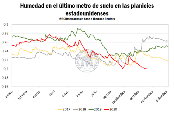 El estado de humedad en los suelos para esta época se encuentra en los valores más bajos en los últimos cuatro años en las Planicies de los Estados Unidos según información de la agencia Reuters. Esto condujo a que las estimaciones para Dakota del Norte, segundo estado en el ranking de producción de trigo en el país del norte, hayan visto un recorte de 200.000 toneladas para este año respecto del año anterior. Sin embargo, Kansas, que representa cerca de un cuarto de la producción de trigo de ese país, es el Estado que se ha visto más afectado por la falta de lluvia y se estima que el periodo de siembra, que está en curso actualmente, sea el más seco en 126 años, desde que se tiene registro. La lluvia acumulada en el período Agosto-Octubre es un 59% menor de las condiciones normales. Esto propició un severo ajuste en su estimación productiva para la campaña, ubicándose en 7,6 millones de toneladas, por debajo de las 9,5 millones de toneladas que registro el año anterior, según datos del USDA, lo que representa una caída del 20% interanual.