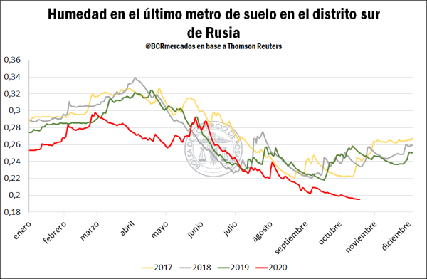 La escasez de humedad en el suelo también es un factor que afecta a Rusia, particularmente en la principal región productora, el Distrito Sur, de donde proviene el 40% del total de su producción. En esta región, la humedad en los suelos se encuentra largamente en su nivel más bajo en los últimos 4 años. Además, para sumar al estrés hídrico, los pronósticos climáticos aseveran que este será uno de los meses de octubre más secos de los que se tienen registros. Sin embargo, a pesar de estas adversas condiciones, la siembra del trigo de invierno avanza a buen ritmo, y ya se han completado 17,5 millones de hectáreas, lo que representa un 91,5% del área total estimada, según detalló la consultora Refinitiv.