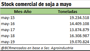 Según informa la Secretaría de Agroindustria, el stock comercial al mes de mayo resultaba el más alto de los últimos cuatro años, sugiriendo una buena provisión en manos de acopios, industriales y exportadores que evita la necesidad de salir a buscar mercadería convalidando mayores precios. Según muestra el cuadro adjunto, el inventario en manos de intermediarios y usuarios finales del grano sumaba 19 millones de toneladas, casi 3 millones de toneladas más que el que tenían a la misma altura del año pasado así como también del promedio de los últimos cuatro años.