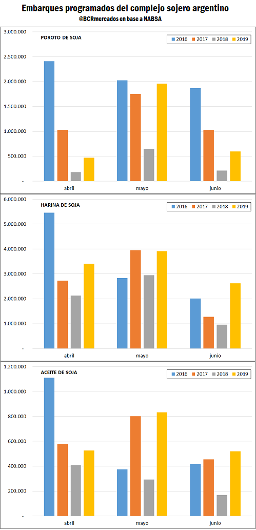 Cabe destacar, sin embargo, que el volumen de embarques del mes de mayo también alcanzó muy altos niveles en comparación con los años recientes, según puede inferirse a partir de datos de NABSA. Se estima que en dicho mes se habrían embarcado casi 2 millones de toneladas de poroto de soja, 3,9 millones de toneladas de harina de soja y algo más de 800.000 toneladas de aceite de soja.
