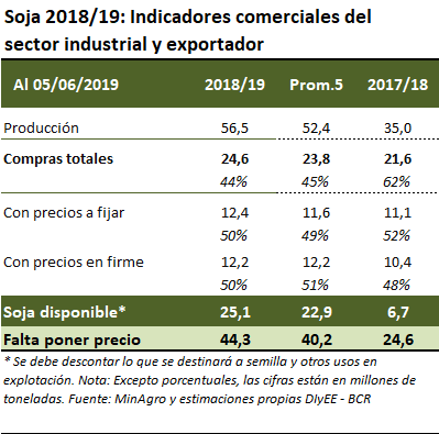 Los actuales precios restringen las ventas de los productores a lo estrictamente necesario, aminorando la actividad en el recinto. Las compras de grano por parte de industriales y fábricas, de cualquier modo, se mantiene en línea con lo observado a la misma altura de años anteriores con adquisiciones totales por 24,6 millones de toneladas, la mitad de ellas en condición a fijar y la otra mitad con precio en firme. A su vez, la soja aún remanente para vender vuelve a estar en línea con el promedio de los últimos cinco años, muy por encima de la ajustada disponibilidad de junio 2018.
