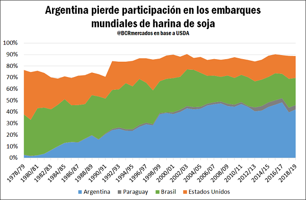 Cerniéndonos a los datos del USDA, la recuperación del volumen de soja procesada por el país permitiría un avance de las exportaciones de harina de soja a 28,1 Mt, por encima de los 25,4 Mt del año anterior pero por debajo aún de los 31,3 Mt alcanzado dos años atrás. De este modo, la participación de nuestro país en las exportaciones mundiales de harina de soja resultaría del 42%, muy por debajo del récord del 48% alcanzado hace dos campañas. En el ínterin, tanto Brasil como Estados Unidos mejoran su desempeño alcanzando una participación del 24% y 19%, respectivamente.