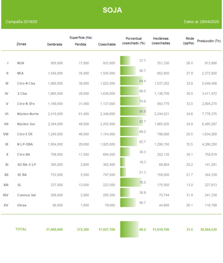 Pese a las lluvias registradas durante los días previos, la cosecha alcanzó un avance intersemanal de 11,8 puntos porcentuales y cubre el 68,2 % del área apta. El rinde medio nacional descendió a 31,5 qq/Ha y, luego de recolectarse más de 11,6 MHa, el volumen parcial acumulado supera las 36,5 MTn. Bajo este escenario, mantenemos nuestra proyección de producción en 49,5 MTn.
