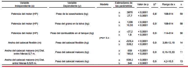 Tabla 1. Modelos lineales y estimación de sus parámetros sobre variables de las cosechadoras de granos. Referencias: R2: coeficiente de determinación; Rango de x: valor máximo y mínimo del eje x; n: números de datos.